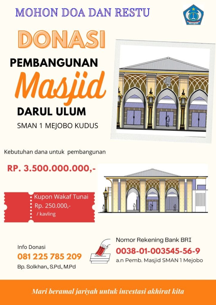 Untuk penyaluran infaq dapat melalui nomor rekening Bank BRI 003801003545569 a.n Pemb Masjid SMAN 1 Mejobo.