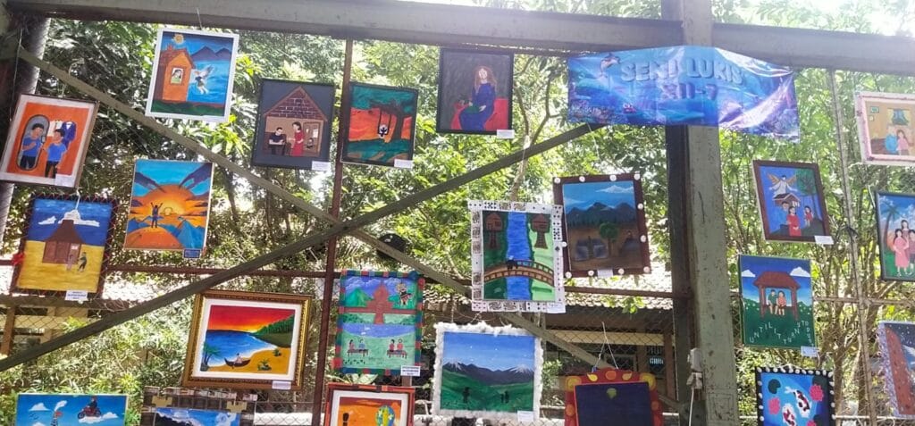 tak hanya menampilkan tarian, murid kelas XII juga memamerkan lukisan di sisi utara dan depan lapangan indoor. pagar besi yang menjulang tinggi dipenuhi dengan gantungan lukisan karya murid kelas XII. Lukisan bertema beragam. dari kerusakan pohon, kehilangan teman, impian, perundungan hingga kesepian menjadi tontonan yang menarik di lapangan indoor.